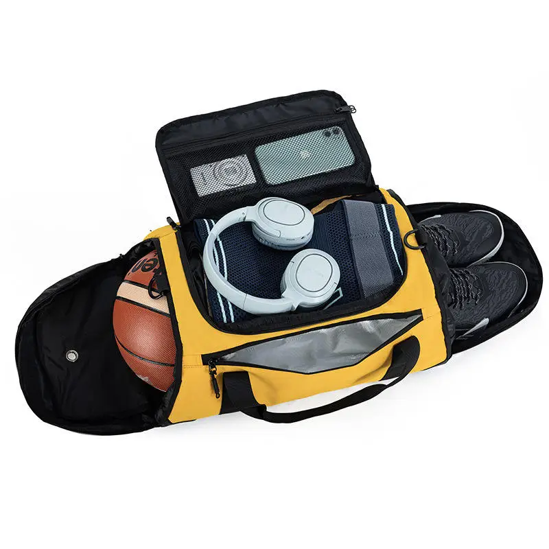 40-55L large-capacity polyester sports gym bag: waterproof, dry-wet separation, expandable storage, air-cushioned shoulder strap. Unisex for basketball training/fitness/travel. Supports bulk orders with flexible MOQ.